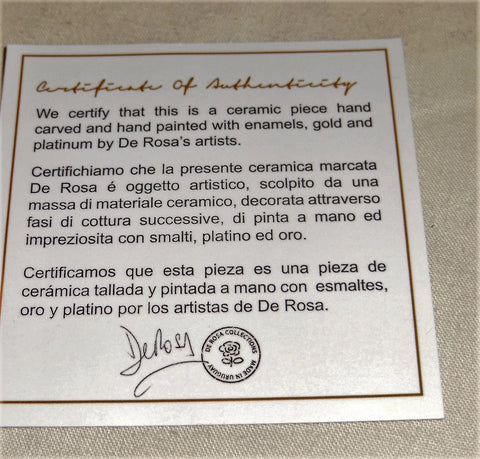 Hand carved and Hand Painted in Uruguay, De Rosa sculptures are accented with platinum, gold and vibrant enamel glazes.